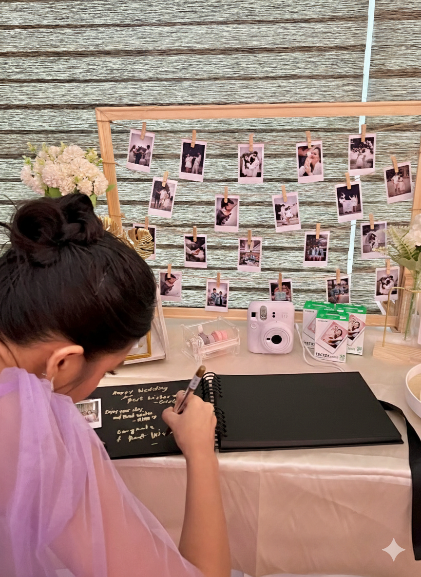 Guests take a polaroid photo, paste it into the guestbook, and write a short message beside it. By the end of the event, the guestbook fills up naturally.